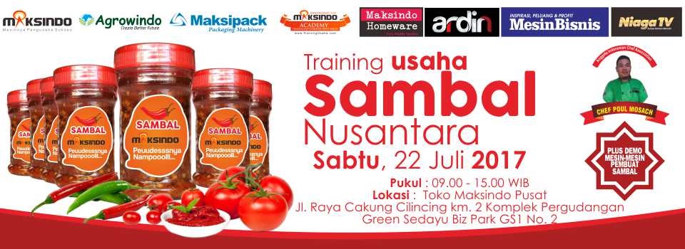 Sambal sangat terkenal dan berkembang di Indonesia. Berbagai jenis sambal dikenali di masyarakat luas dan berbagai macam jenis olahan sambal menjadi daya tarik tersendiri untuk para penikmatnya dan sambal juga sekarang merupakan peluang bisnis kuliner yang sangat menjanjikan. Oleh karena itu, Toko Mesin Maksindo yang dikenal sebagai ahlinya mesin-mesin bisnis kuliner terbaik, bekerja sama dengan Chef Poul Mosach dari ICA(Indonesion chef Assosiation) akan mewujudkan impian anda untuk memulai dan mengembangkan bisnis Kuliner terutama dalam hal bisnis Usaha Sambal Nusantara.