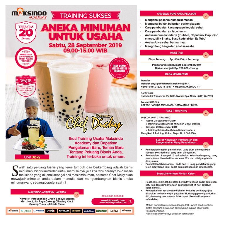 Ikuti Training Usaha Maksindo Academy dan Dapatkan Pengalaman Baru, Teman Baru Tentang Peluang Bisnis Anda, Training ini terbuka untuk umum. Salah satu peluang bisnis yang terus tumbuh dan berkembang adalah bisnis minuman, bisnis ini mudah untuk memulainya,jika kita tahu caranya Toko mesin maksindo yang dikenal sebagai ahli mesin minuman, bersama Chef Dicky akan mewujudkan impian anda dalam memulai dan mengembangkan bisnis aneka minuman yang sedang populer saat ini.
