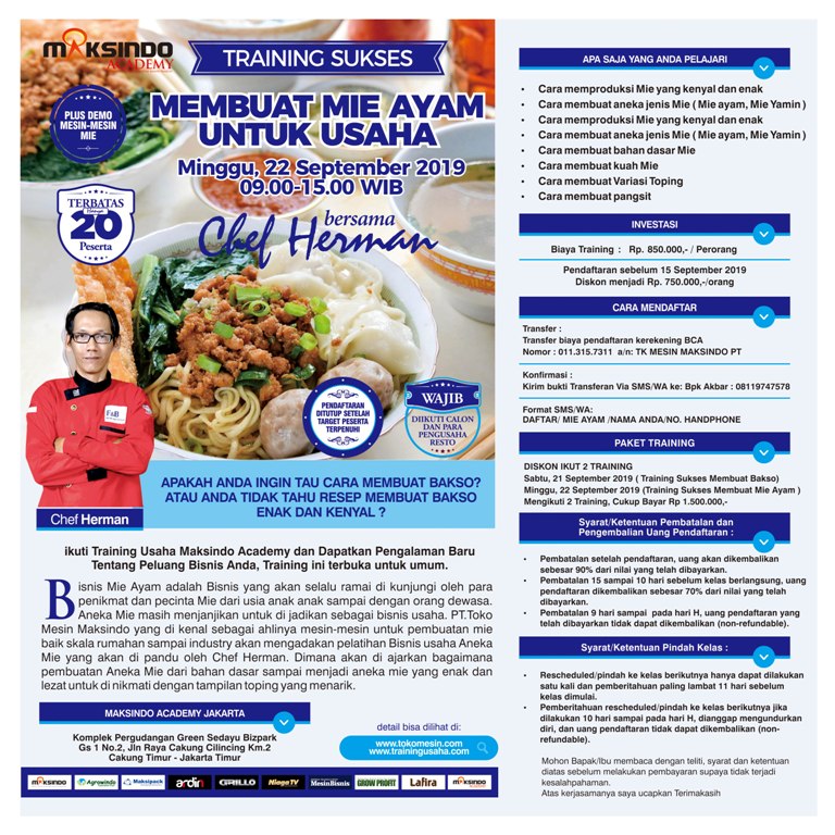 Anda ingin memiliki usaha Aneka Mie Ayam, tapi tidak tahu resep dan memulainya dari mana? ikuti Training Usaha Maksindo Academy dan Dapatkan Pengalaman Baru Tentang Peluang Bisnis Anda,Training ini terbuka untuk umum. Bisnis Mie Ayam adalah Bisnis yang akan selalu ramai di kunjungi oleh para penikmat dan pecinta Mie dari usia anak anak sampai dengan orang dewasa. Aneka Mie masih menjanjikan untuk di jadikan sebagai bisnis usaha. PT.Toko Mesin Maksindo yang di kenal sebagai ahlinya mesin-mesin untuk pembuatan mie baik skala rumahan sampai industry akan mengadakan pelatihan Bisnis usaha Aneka Mie yang akan di pandu oleh Chef Herman. Dimana akan di ajarkan bagaimana pembuatan Aneka Mie dari bahan dasar sampai menjadi aneka mie yang enak dan lezat untuk di nikmati dengan tampilan toping yang menarik.